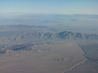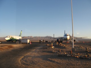 We both slept on the flight up to Antafagasto, where about half of the passengers departed. There was nothing, and then all of a sudden the city came out of nowhere, right on the coast, with nice beaches, including some sand cliffs. The flight from there to Calama was only about 20 minutes, with more moonscapes. The airport in Calama was tiny, probably no bigger than the Maun airport.