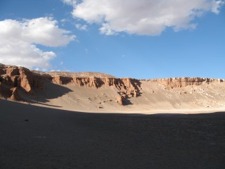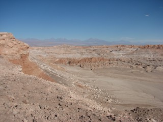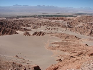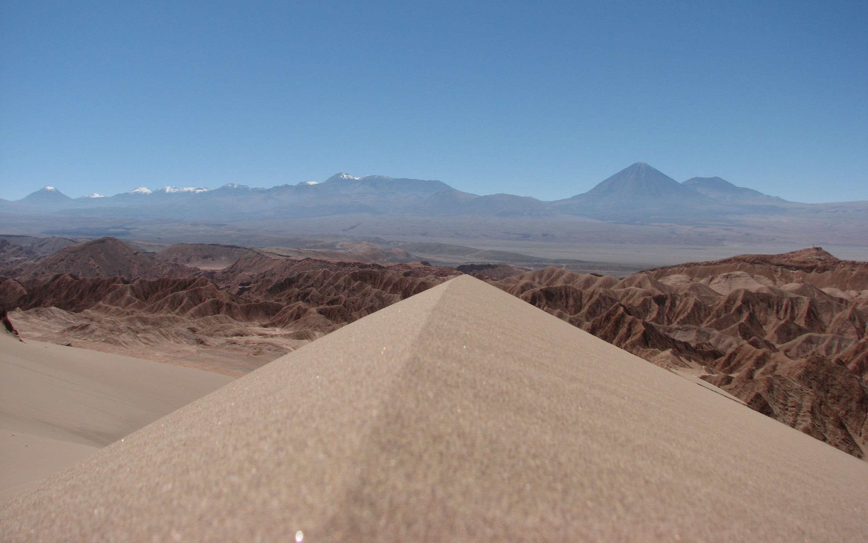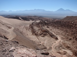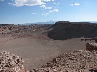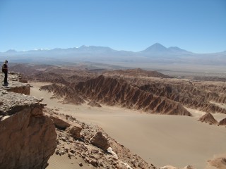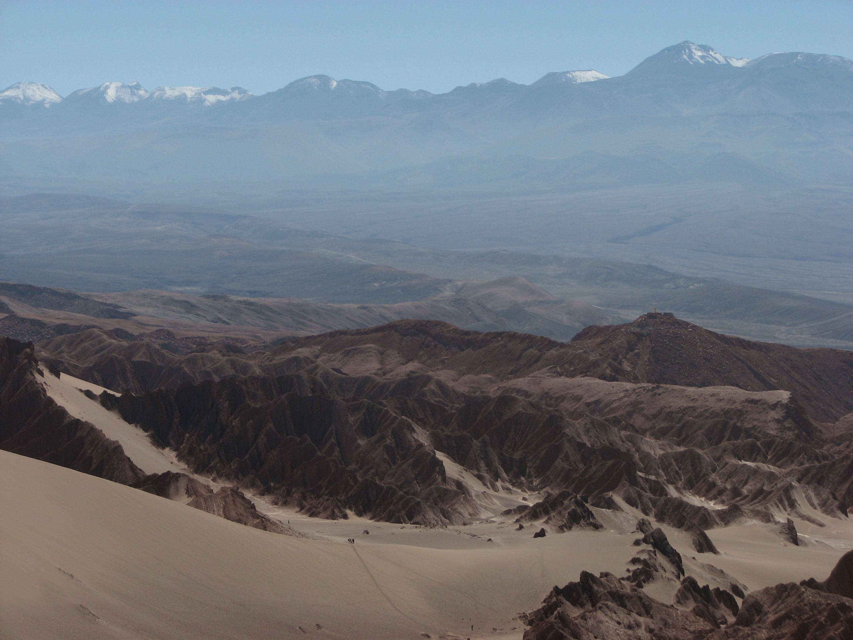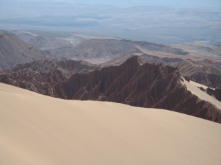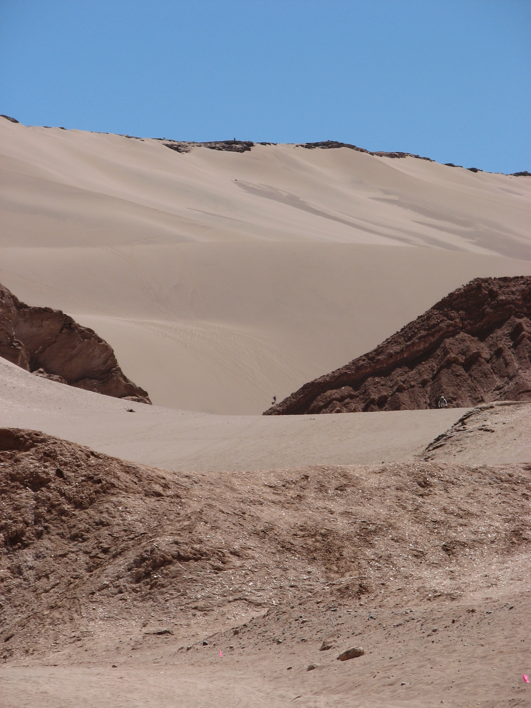 We headed out northwest from San Pedro for about 15 minutes. We started looking out over the salt range and some sand dunes, with the snow-capped Andes in the background - very picturesque. We headed out on the ridge, looking down over San Pedro and the salt range. We saw some people down in the bowl, apparently sandboarding some of the dunes. After walking down a ways we got to do something very fun.