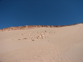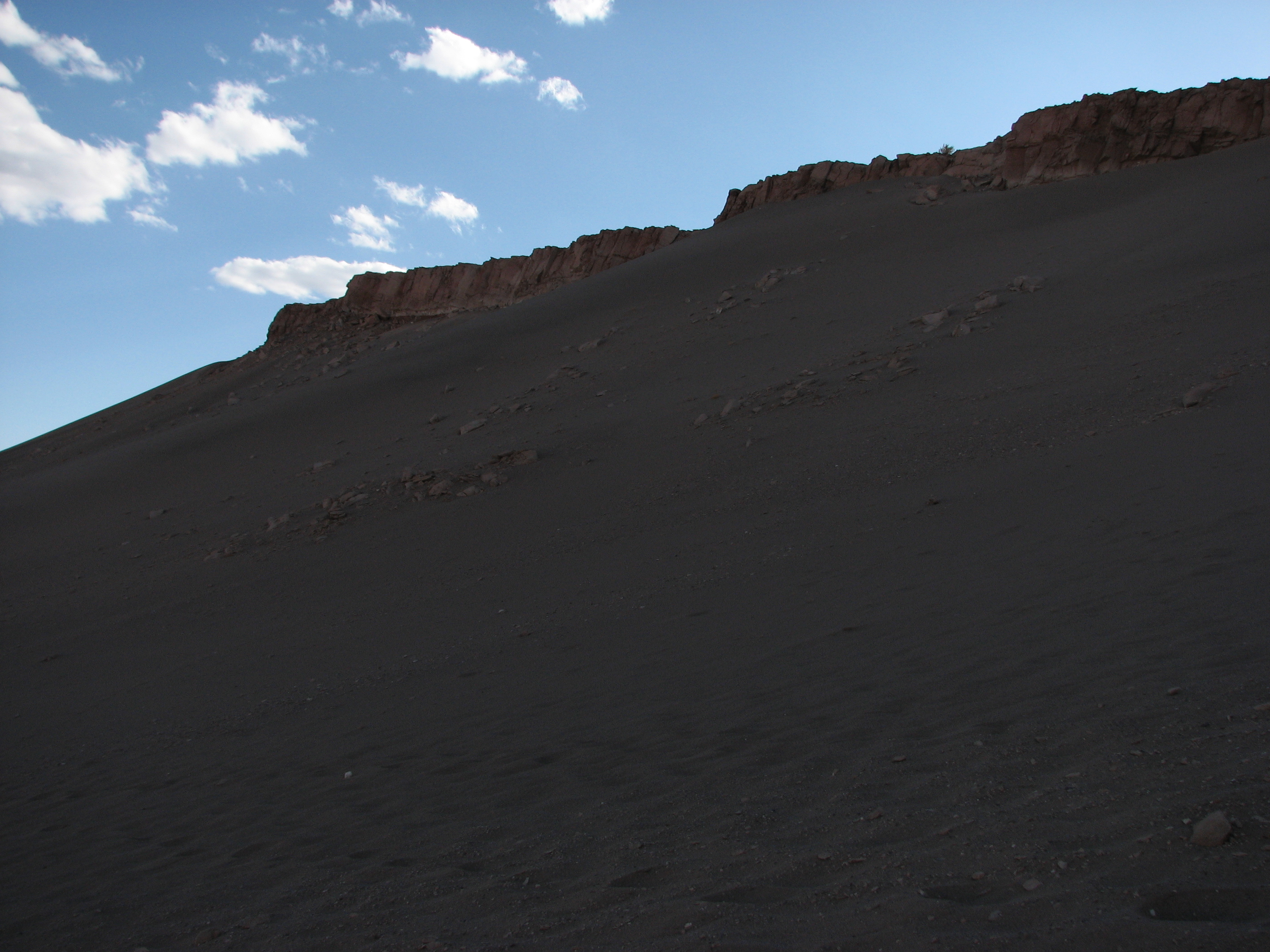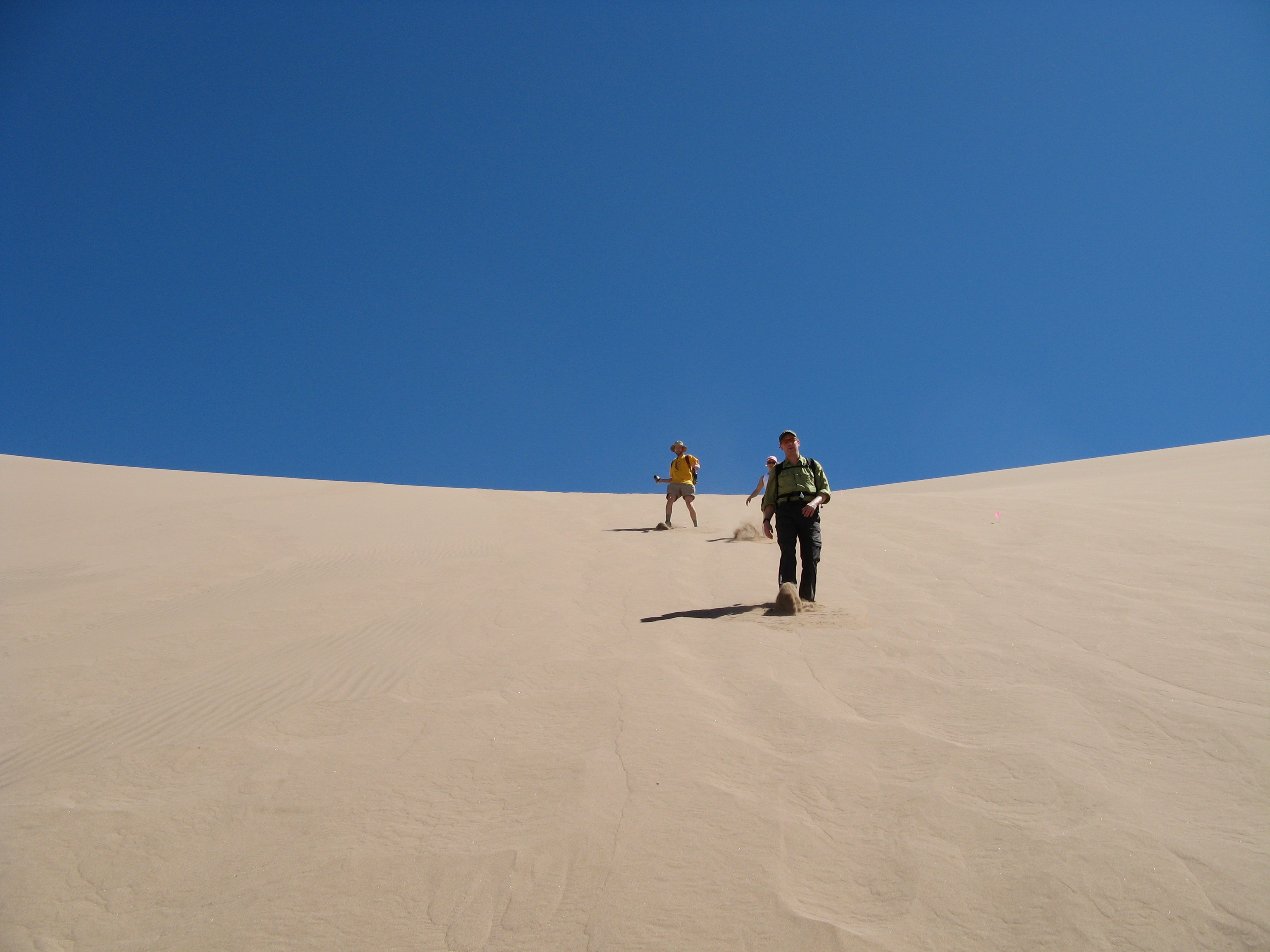 We came down the major sand dune, probably 100 meters tall. Our feet were completely in the sand, and it was best to keep our heels dug in to prevent falling.