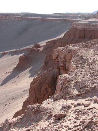 We started out near where we started this morning, but this time we went generally southeast instead of northwest. We were on a tall ridge above a sand dune, with a large flat bed at the bottom. We walked around the ridge for about 20-30 minutes. After that we walked down the sand dunes (not nearly as steep or as fun this time) to the bottom. At the bottom, we were in the middle of nowhere, surrounded by mountains and ridges on all sides.