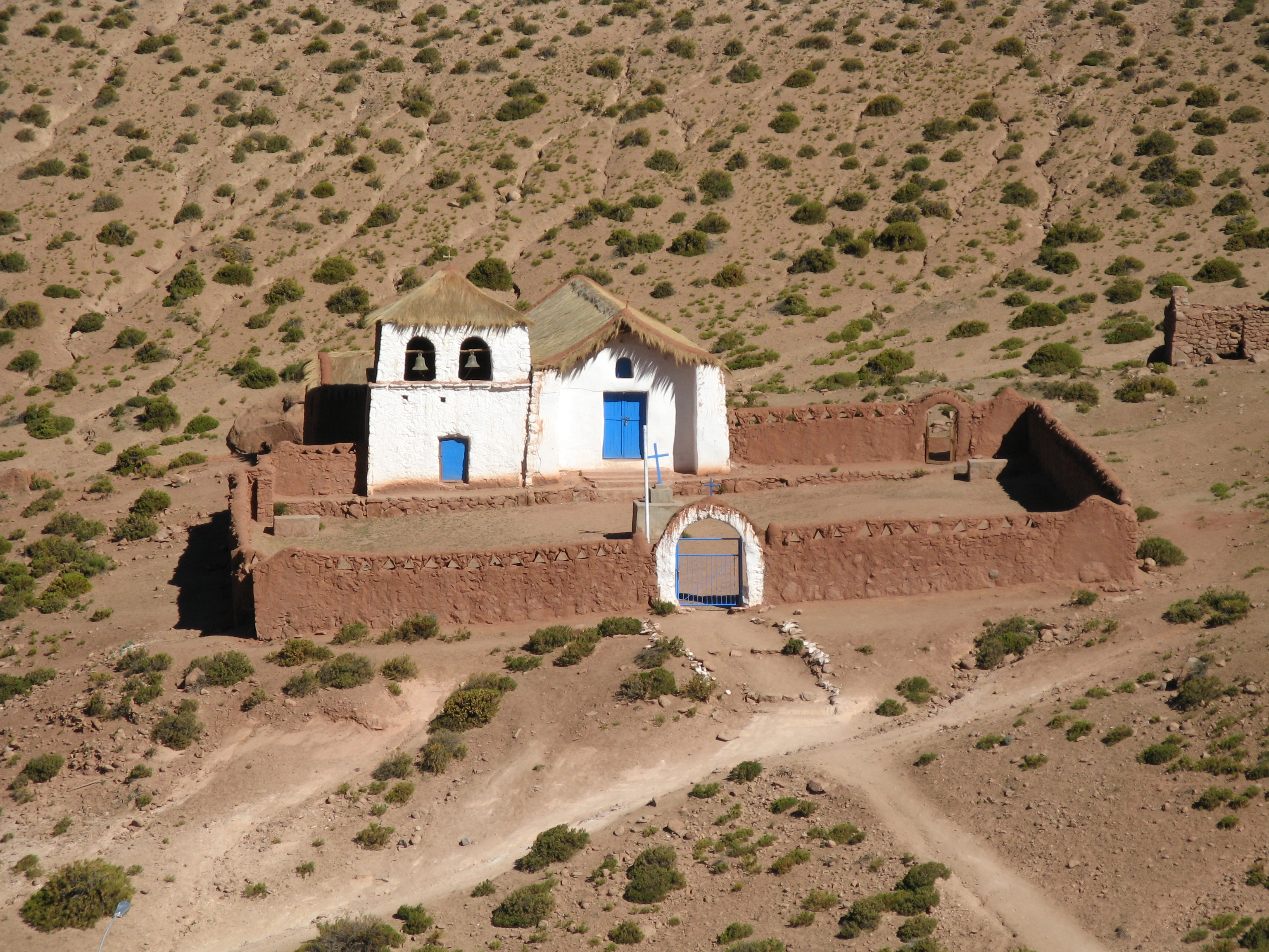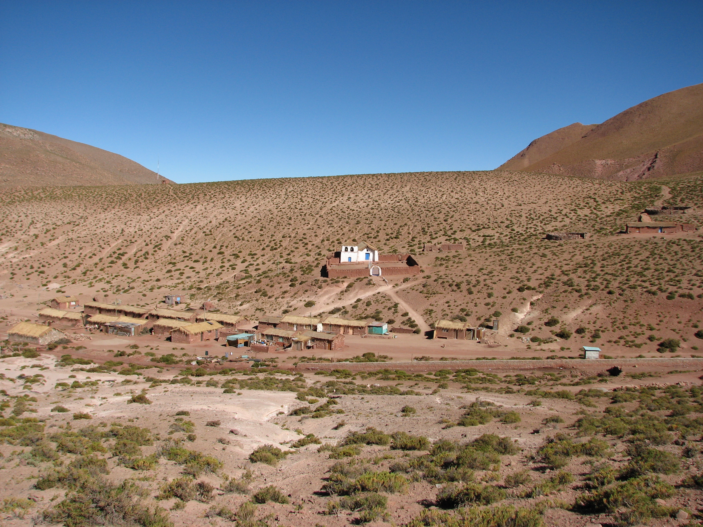 The four of us, plus Cesar and Javiera got in the car and embarked on a 2 hour journey basically northeast, going well up in elevation. We started to see some greenery as we got into a couple of places that got a little bit more rain. There were some tall cacti, tall as 2m, which must have taken a long time since they grow only 1-2cm per year. As we got even higher, we started to see some llamas and vicunas. We also stopped at a small, very small, town, which basically fit in a single photo.