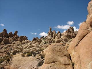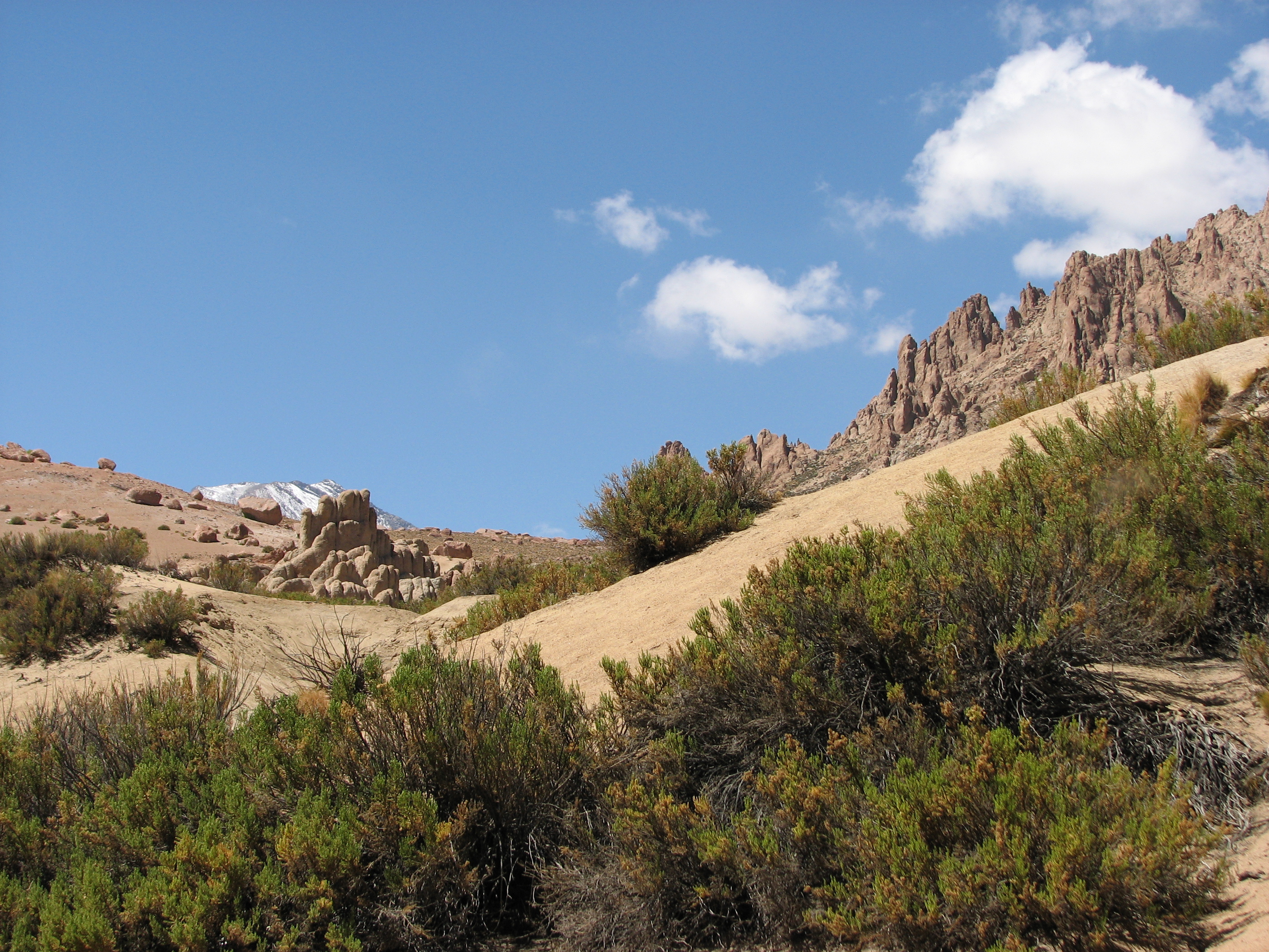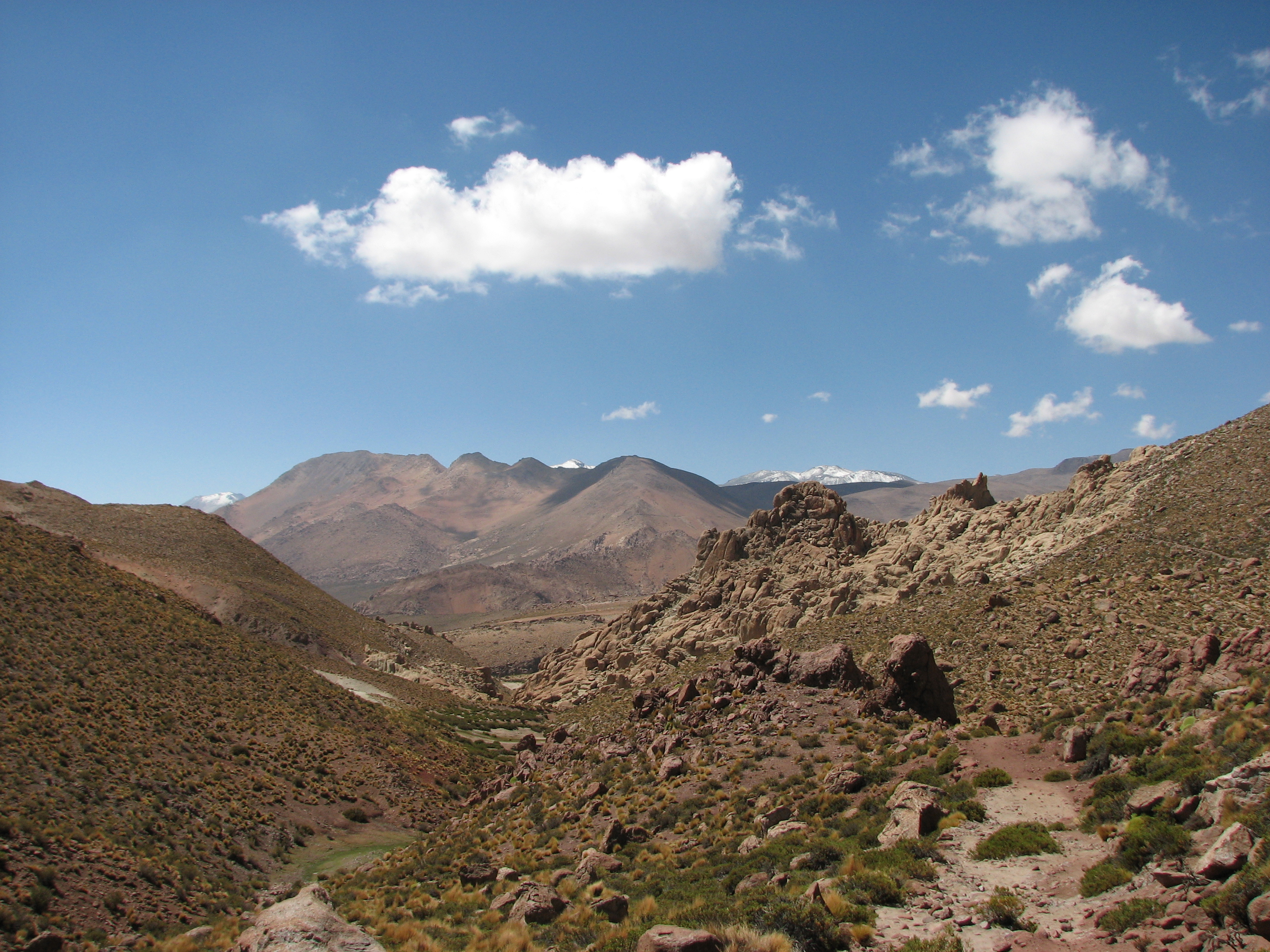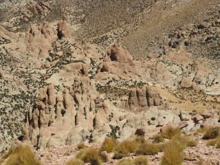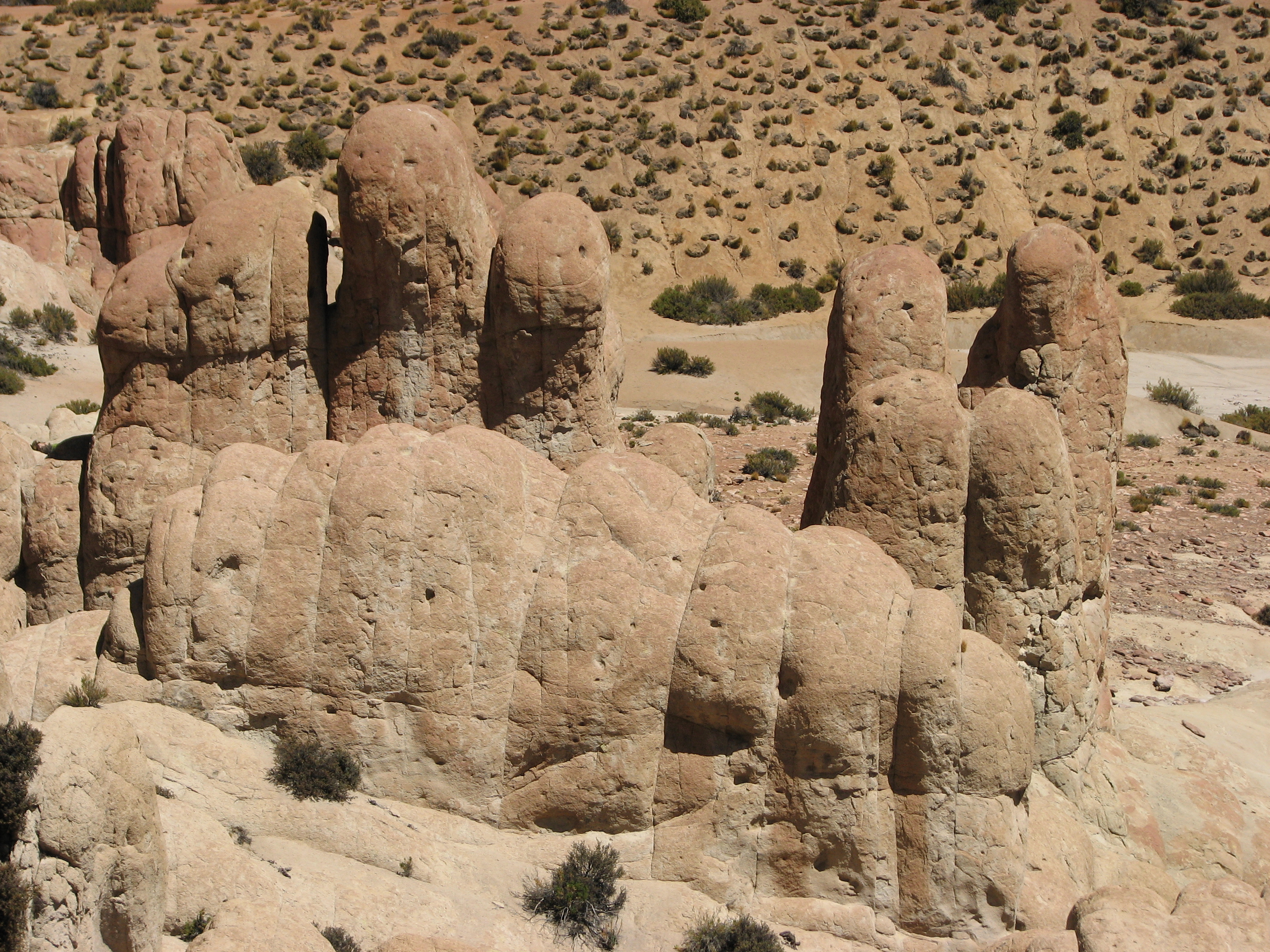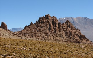 The scenery was amazing, with jagged rock formations close to us, active volcancoes and the snow-capped Andes off in the not-to-far distance, and panoramic views to boot. We saw mice-looking droppings and asked Javiera what these were, she told us they were from a Viscacha, similar to a rabbit. While she and Cesar were explaining what they looked like, one actually came up and we got to see for ourselves. We were generally walking level or downhill, which was problematic, since we knew the car was not moving and we were going to have to walk back up all of this. Near the bottom, there were a bunch of rounded rocks, sticking up like fingers from the ground. We took a brief break at the bottom, in a dry riverbed, a little after an hour after we started.