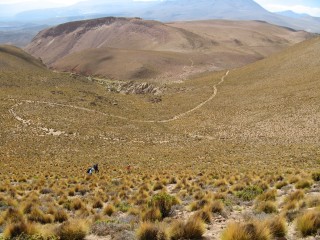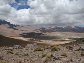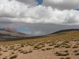 Right near the end was the toughest, straight uphill through loose sand with loose rocks. At this point the group separated, with us following Cesar and Peggy and Mathias going with Javiera. We got up to the "top" – with downhill being the only thing left to the van, and waited about 10 minutes for the others. This did afford us the chance to take some panoramic shots. Once we got down near the van there were even more vista shots, and it appeared it was actually raining or snowing higher up more towards Argentina and Bolivia.
