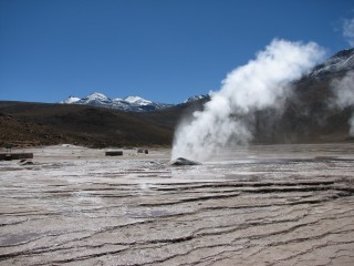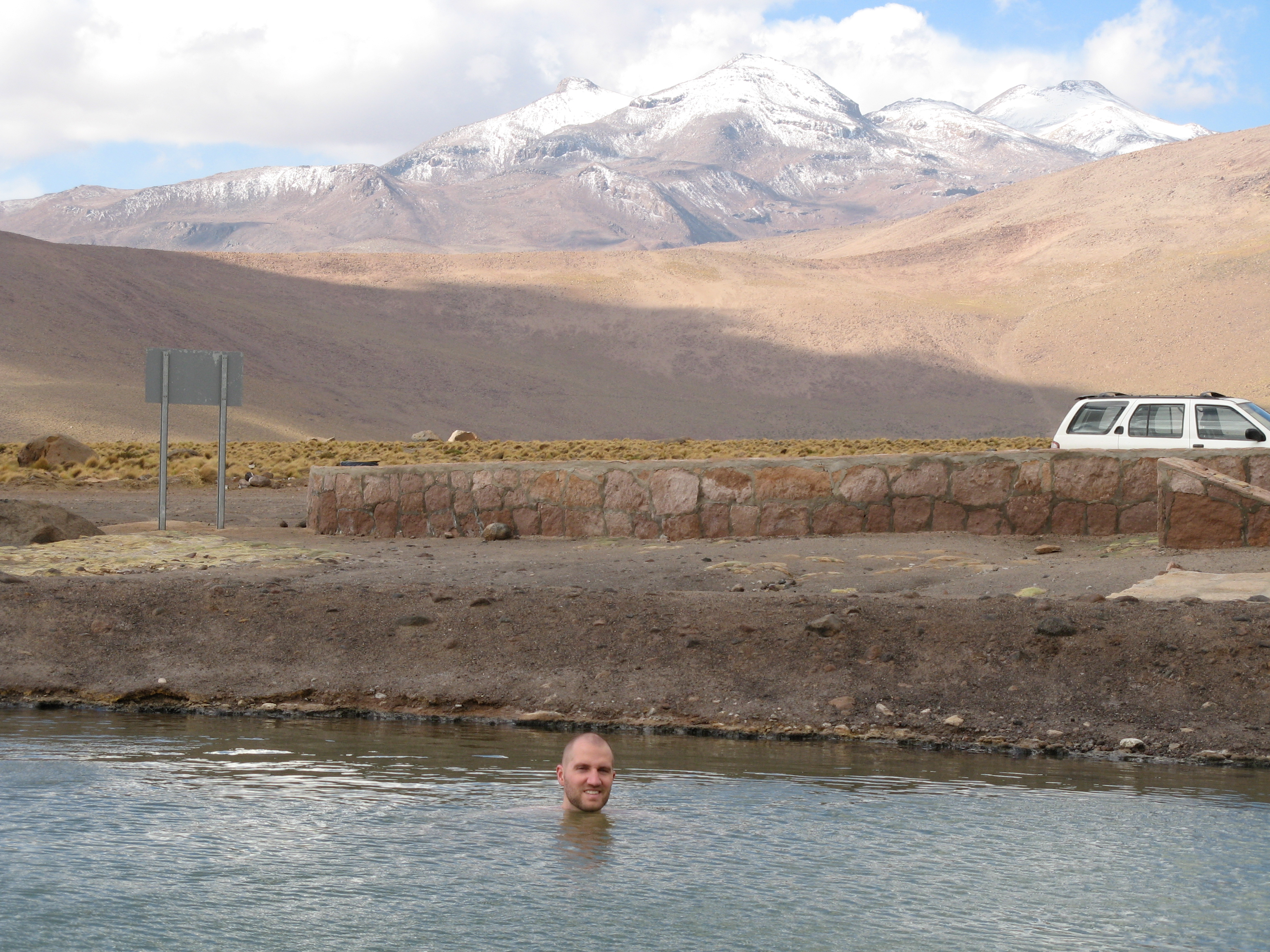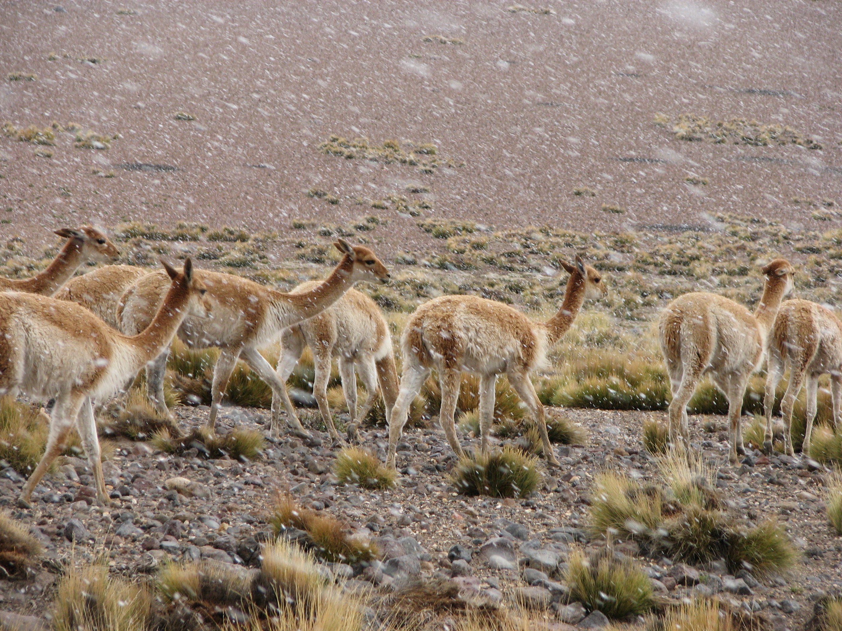We headed down in the van to Tatio, where we changed into swimsuits and went into the hot water pools formed by geothermal activity. After we got out of the pool, they had lunch ready for us, with a number of choices to choose from. It started to get really cold – even colder than before – so we ate in a hurry and got back in the van. As we were finishing up getting in the van, it started to snow on us. This was, as far as he could remember, the first time Justin had ever been snowed on. He had been to the snow, but never when it was snowing. On the way back, it started to snow harder, but the big group of vicunas did not seem to be that disturbed by it.