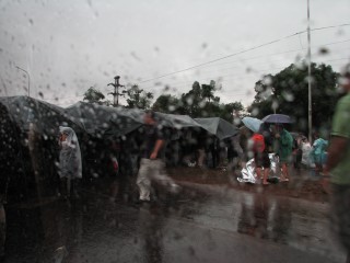 It was painful just sitting there, but very interesting to us since we never see anything like this in the US. People were just lined up across the street, several people deep, with flags and other banners stretched across. It was pouring rain, harder than either of us can ever remember, to the point it looked like a waterfall (imagine that) rather than rain - i.e. it looked like a continuous stream of water.