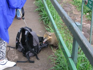 There were many more people in the park on the Brazilian side - probably the effect of the strike on the Argentina side - and getting as many quality photos and videos was tough. On the drive up from the park, there was a recording telling us about the park. The last part lost a little in the translation: "Several of the animals here bite, and some can be aggressive around food. Some of these animals have diseases, such as rabies. Enjoy your trip." The end. Right after entering the park, we did see a Coati (a raccoon relative) take food out of a ladies backpack.